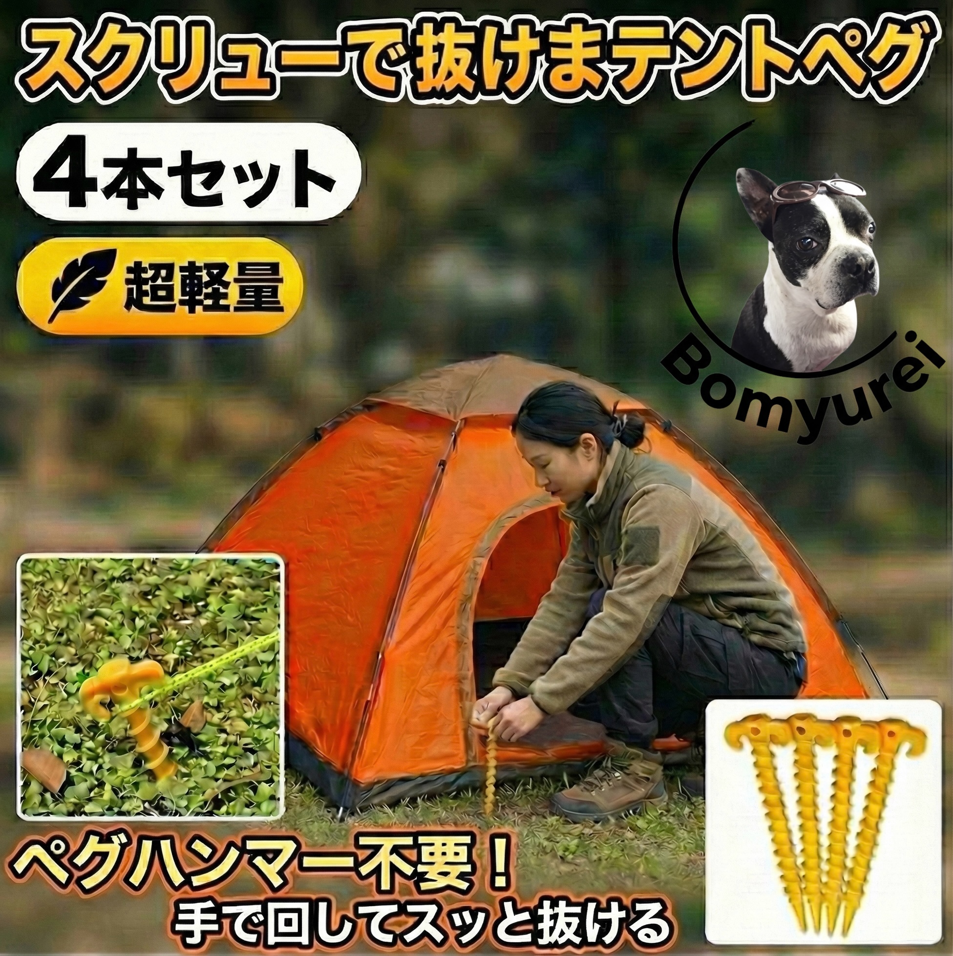 まわしながら差し込んでしっかり固定し抜けにくい、スクリューで「抜けまテントペグ」4本セットです。