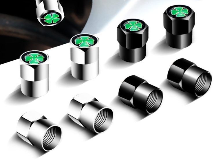 ラッキーな四つ葉のクローバー柄のタイヤバルブキャップ4個セットです。