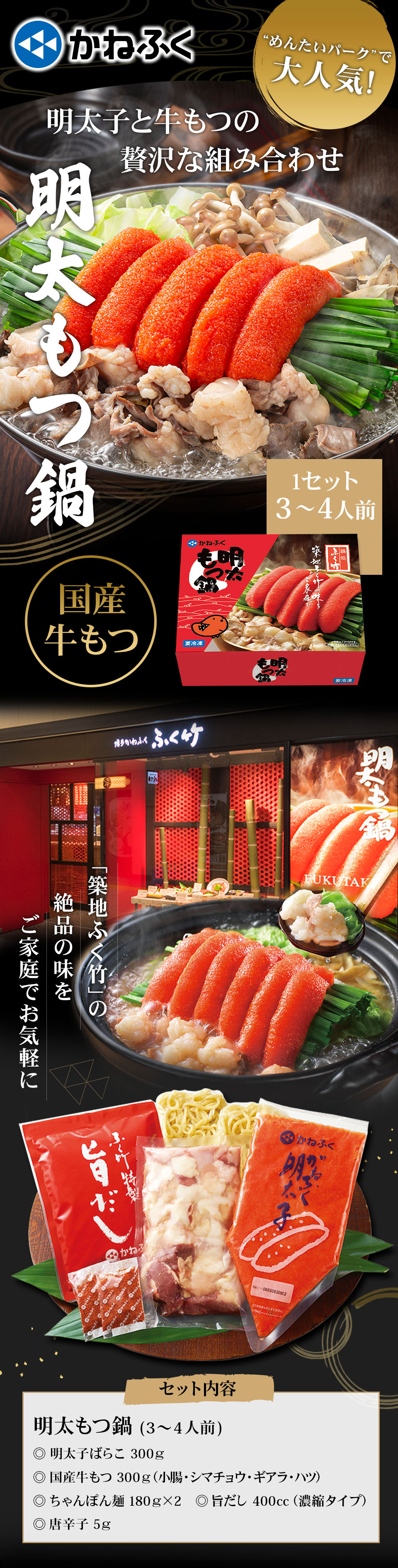 かねふく 明太もつ鍋セット お取り寄せ 明太子 もつ鍋 3〜4人前 送料無料 めんたいパーク 限定パッケージ ギフト 公式ストア