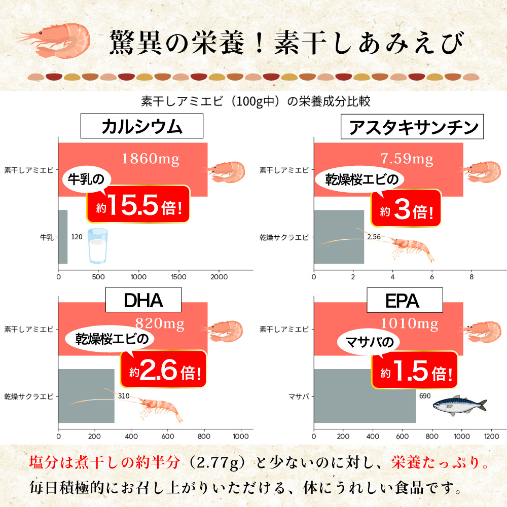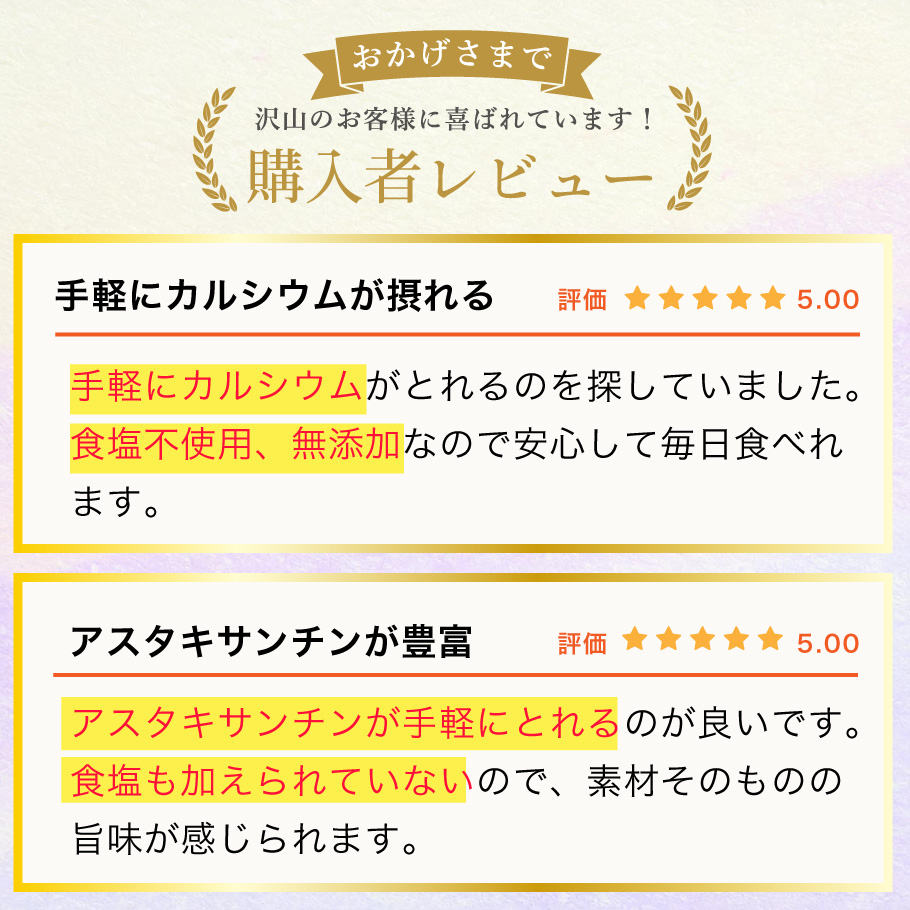カルシウム豊富、免疫向上や抗酸化作用に話題のアスタキサンチン、オメガ3含有。