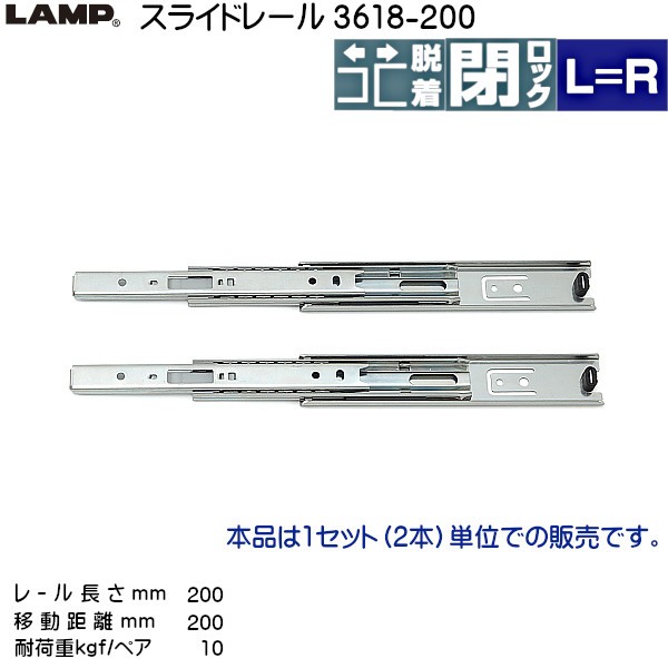 スライドレール LAMP スガツネ 3618-200 耐荷重10kgf/ペア 長さ200mm 移動距離200mm バラ売り (1〜9セット) キッチン収納 左右1セット