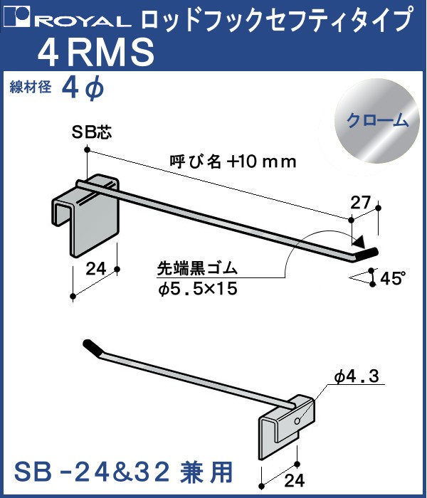 フック ロッドフック セフティ4φ ロイヤル クロームめっき 4RMS-50 サイズ:φ4×50mm 先端黒ゴム付