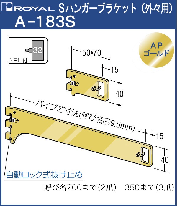 Sハンガーパイプ 水平 ブラケット ロイヤル APゴールド A-183S サイズ:50mm 外々用 50mmのみペッカーサポート不可