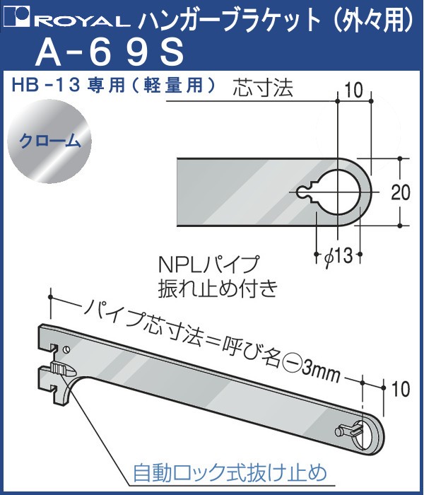 ハンガー ブラケット ロイヤル クロームめっき A-69S 外々用 サイズ:70mm