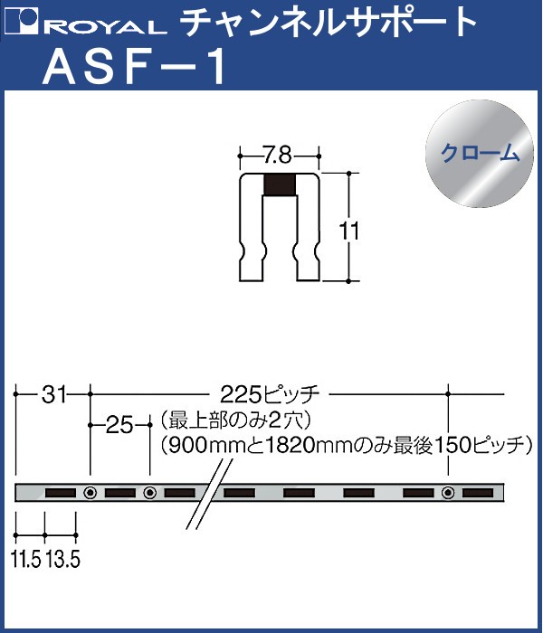 チャンネルサポート 棚柱 ロイヤル クロームめっき ASF-1-600 サイズ 600mm 7.8×11mm シングル