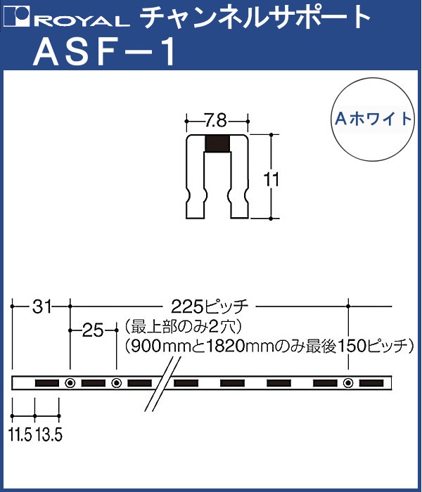 チャンネルサポート 棚柱 ロイヤル Aホワイト塗装 ASF-1-1500 サイズ 1500mm 7.8×11mm シングル