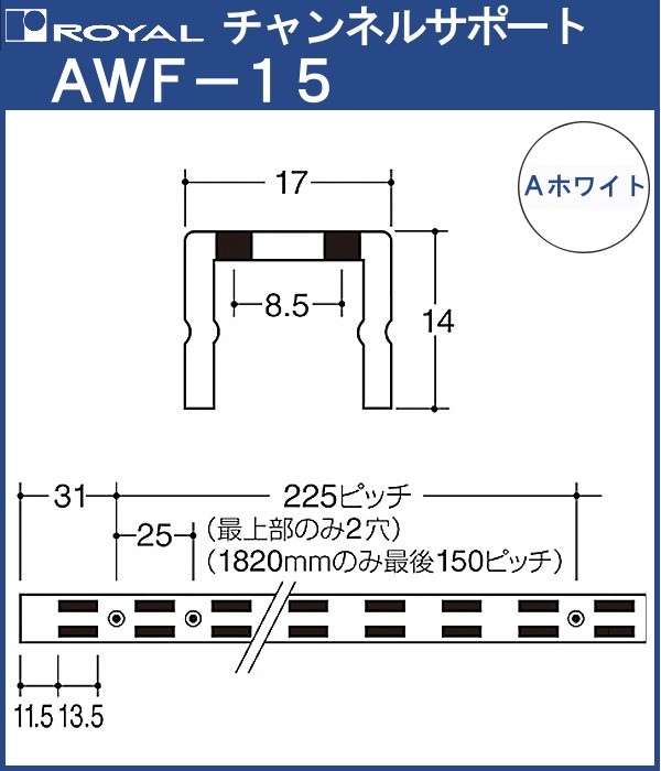 チャンネルサポート 棚柱 ロイヤル Aホワイト塗装 AWF-15-1820 サイズ 1820mm 17×14mm ダブル (日時指定・代引不可)