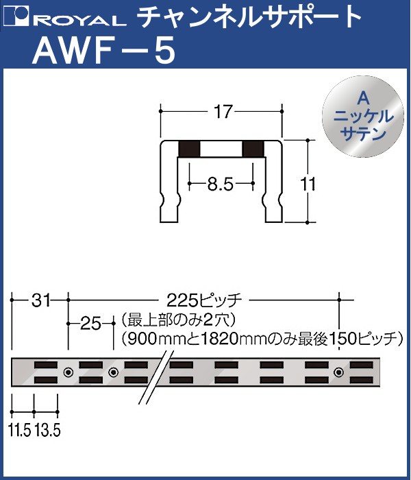 チャンネルサポート 棚柱 ロイヤル Aニッケルサテンめっき AWF-5-1820 サイズ 1820mm 17×11mm ダブル (日時指定・代引不可)