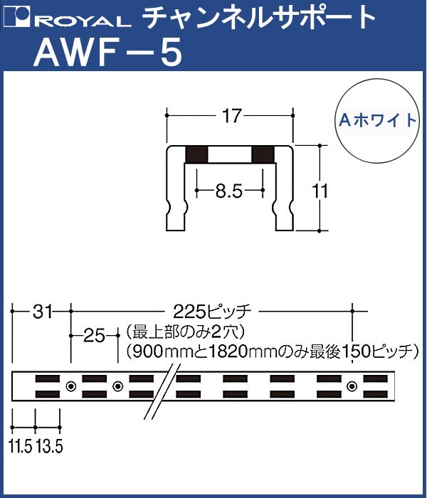 チャンネルサポート 棚柱 ロイヤル Aホワイト塗装 AWF-5-600 サイズ 600mm 17×11mm ダブル
