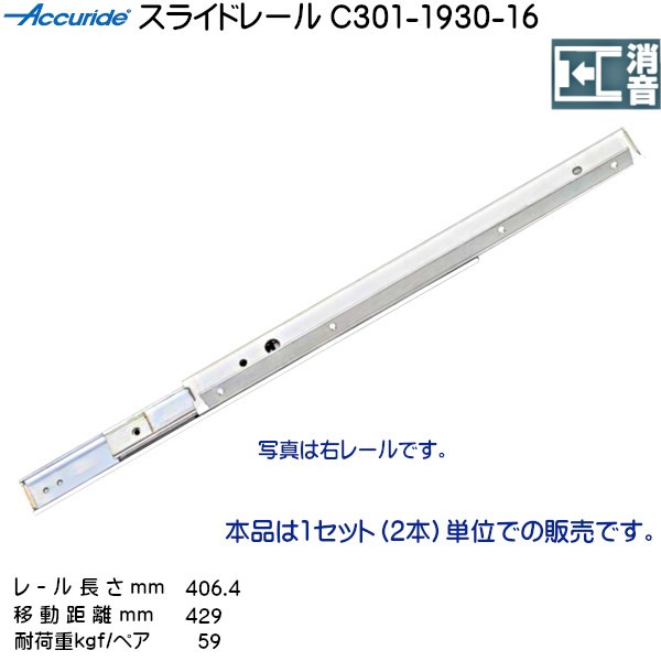 3段引 スライドレール Accuride C301-1930-16 (レール長さ 406.4mm) (厚み20.7×高さ35.3mm) 左右1セット
