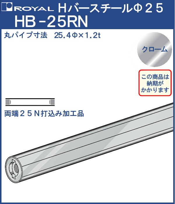 ハンガー Hバー パイプ φ25 (両端打込みナット付) ロイヤル クロームめっき HB-25RN サイズ:φ25×620mm