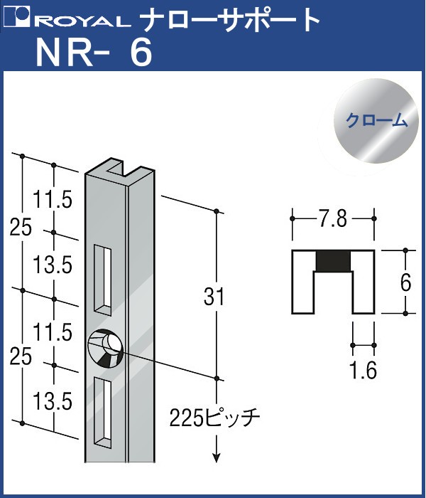 ナローサポート 棚柱 ロイヤル クロームめっきNR-6 -1820 サイズ 1820mm 7.8×6mm シングル (日時指定・代引不可)