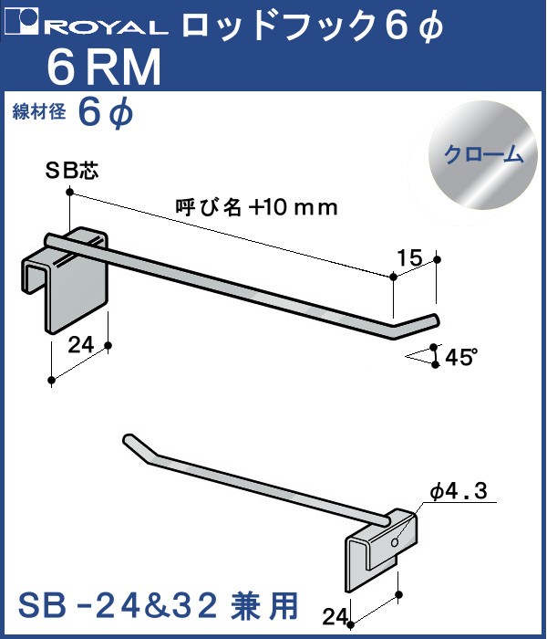 フック ロッドフック 6φ ロイヤル クロームめっき 6RM-150 サイズ:φ6×150mm
