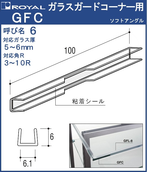 ガラスガードコーナー用 ロイヤル 透明軟質樹脂 GFC-6 対応ガラス厚:5〜6mm 両面テープ付