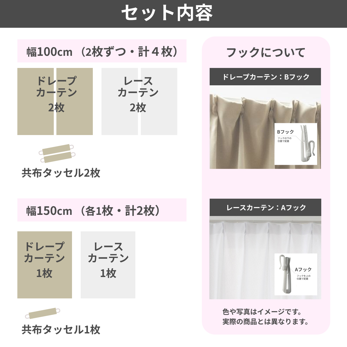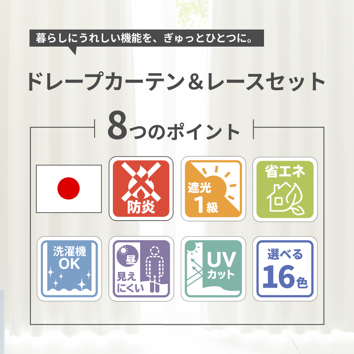 [メーカー直送品/沖縄・離島お届け不可]◎安心の日本製防炎カーテンセット縫製からの工程をすべて日本国内で行っている、安心安全の日本製防炎ドレープカーテン×日本製防炎レースカーテンの4枚セット!
