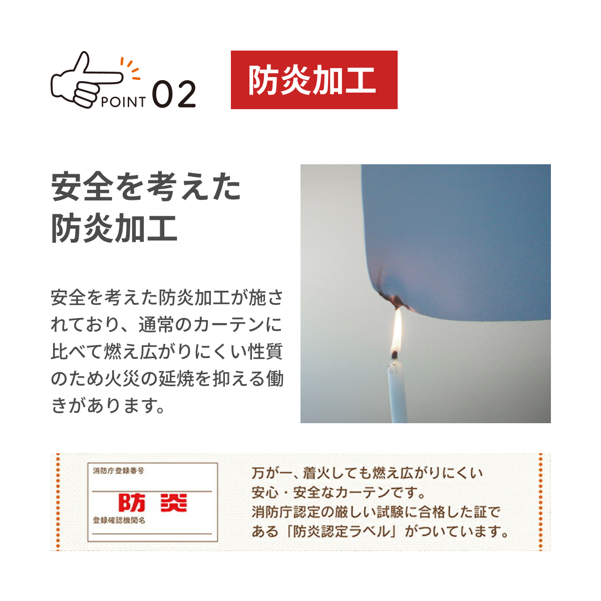 ◎安全を考えた防炎加工防炎ラベルは製品に防炎機能がある事を示す証として防炎機能付きカーテンには、すべて防炎ラベルが縫い付けられています。
