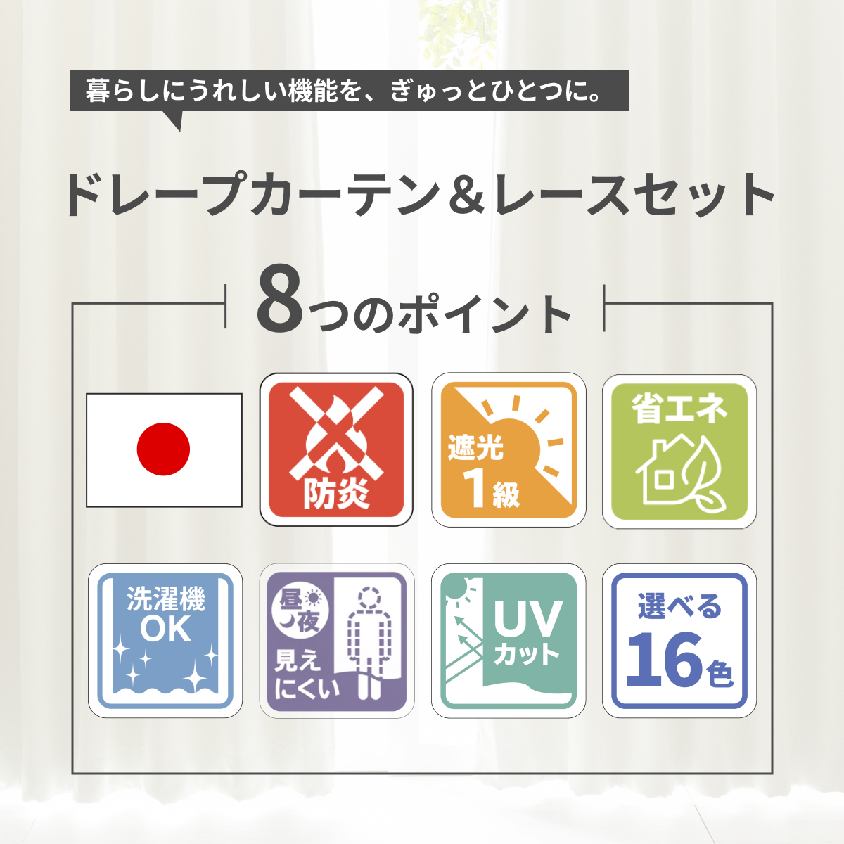 [メーカー直送品/沖縄・離島お届け不可]◎安心の日本製防炎カーテンセット縫製からの工程をすべて日本国内で行っている、安心安全の日本製防炎ドレープカーテン×日本製防炎レースカーテンの4枚セット!