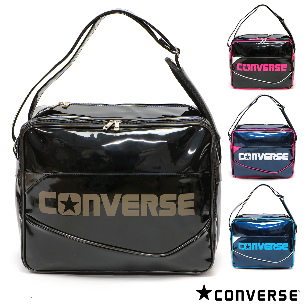 コンバース エナメル ショルダー M メンズ/レディース/中学生/高校生/大学生 エナメルバッグ ブラック/ネイビー W約40cm×H約28cm×D約17cm C2354053