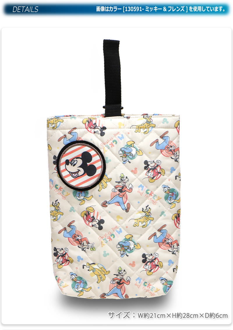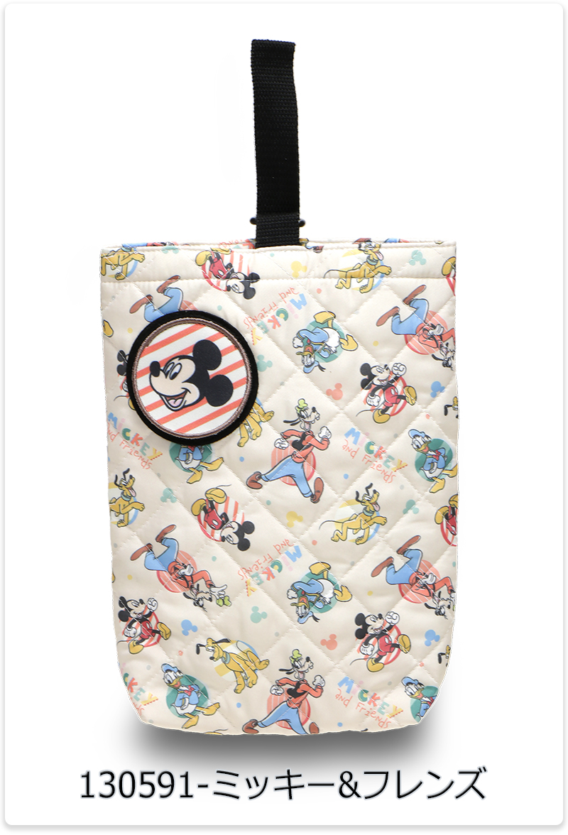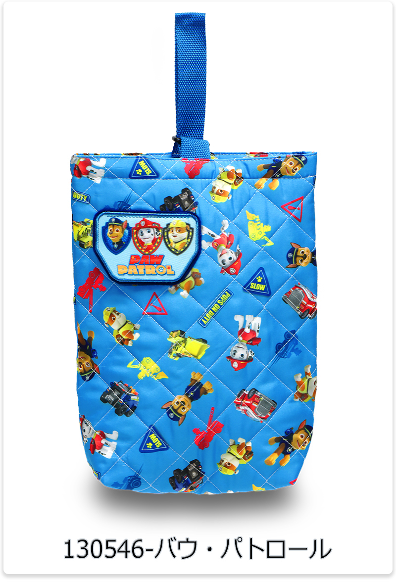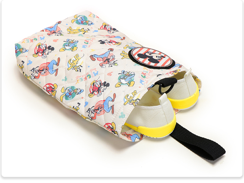 | キッズに人気のキャラクターがプリントされた、キルト素材のシューズバッグ。前面のワッペンはめくると名前が記入可能になっています。 |