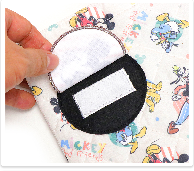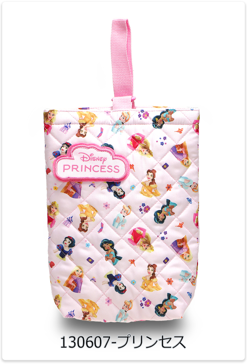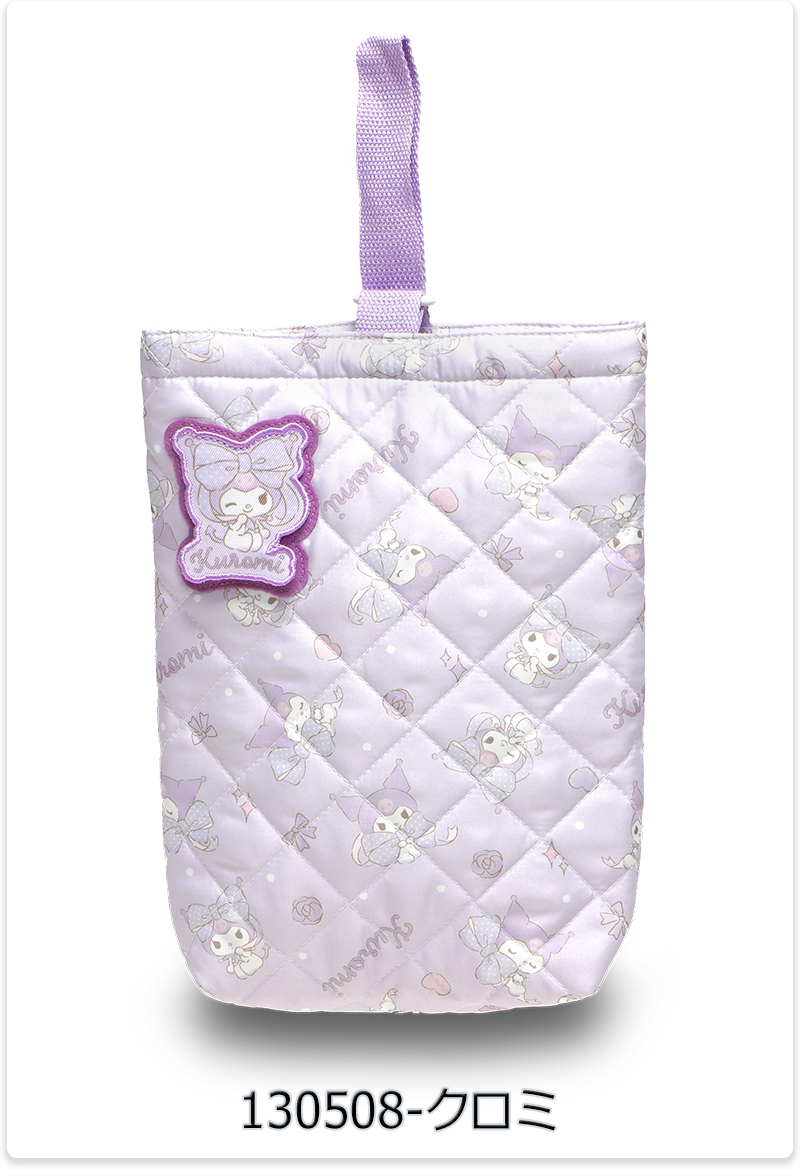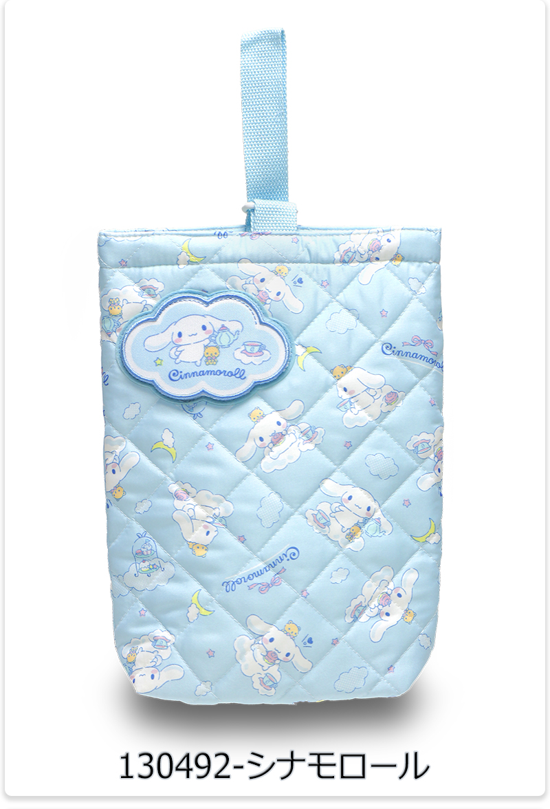 | キッズに人気のキャラクターがプリントされた、キルト素材のシューズバッグ。前面のワッペンはめくると名前が記入可能になっています。 |