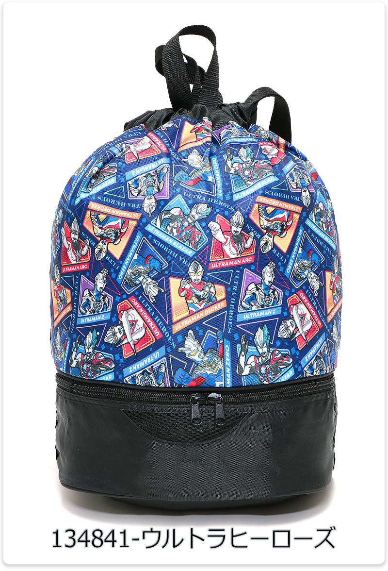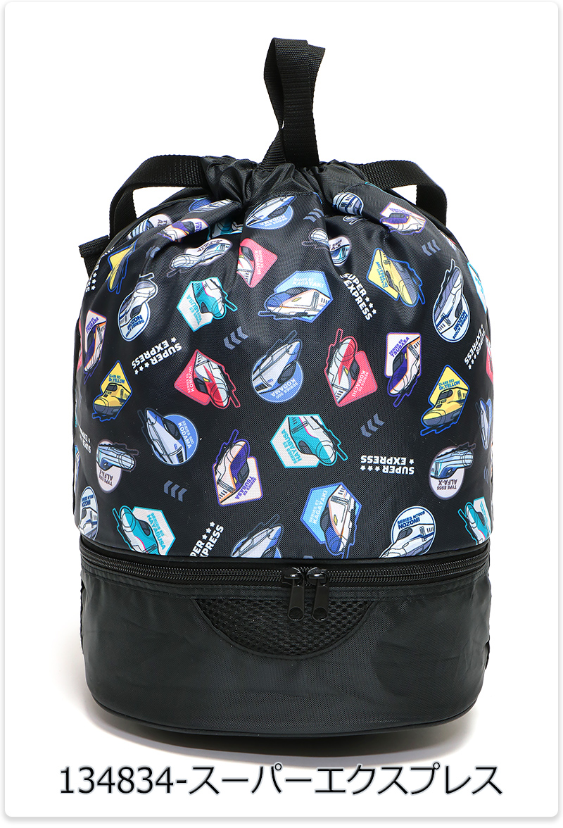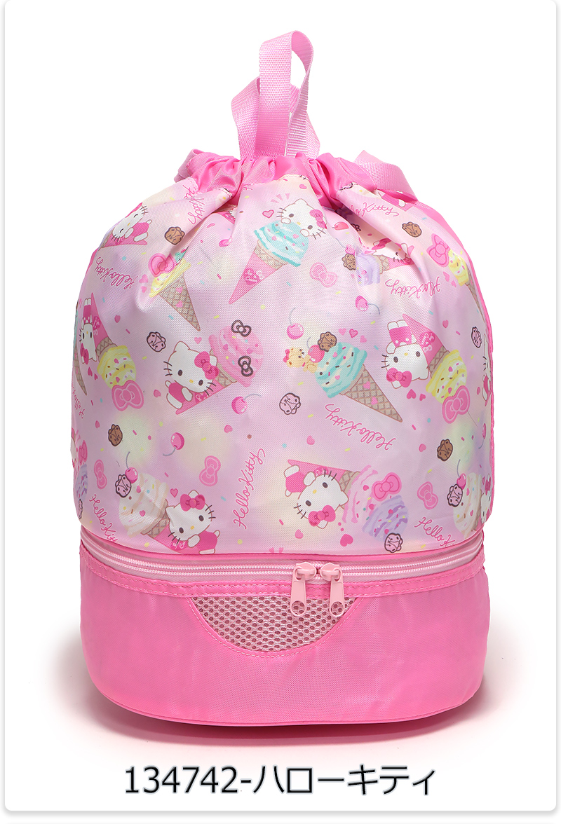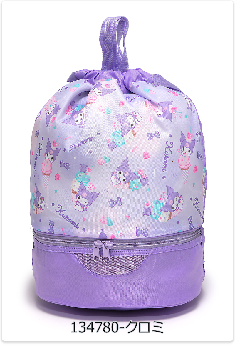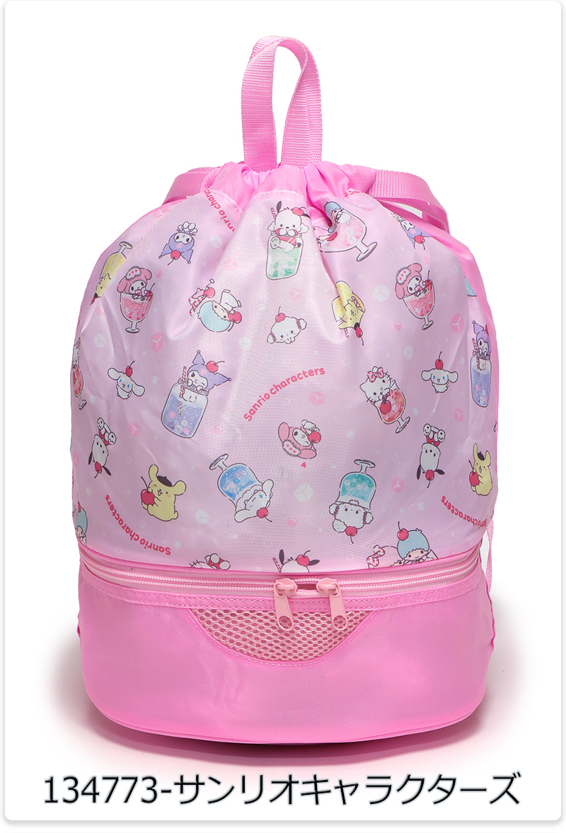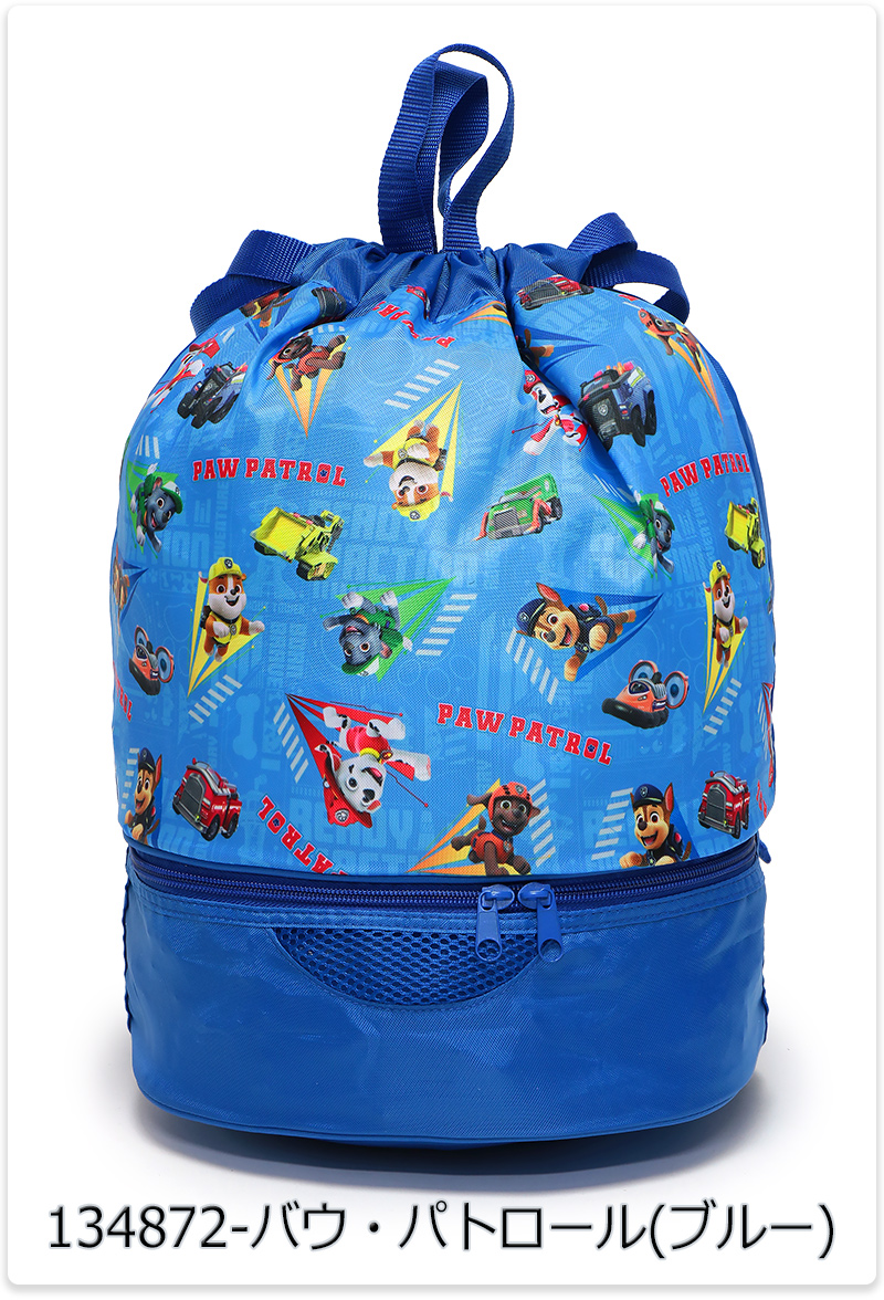 | キッズに人気のキャラクターがプリントされたかわいいナップサック。ポケットはメインとボトムの2ルーム仕様。水着や濡れた衣類などを分けて収納可能です。プールやビーチへのお出かけ用におすすめです。 |