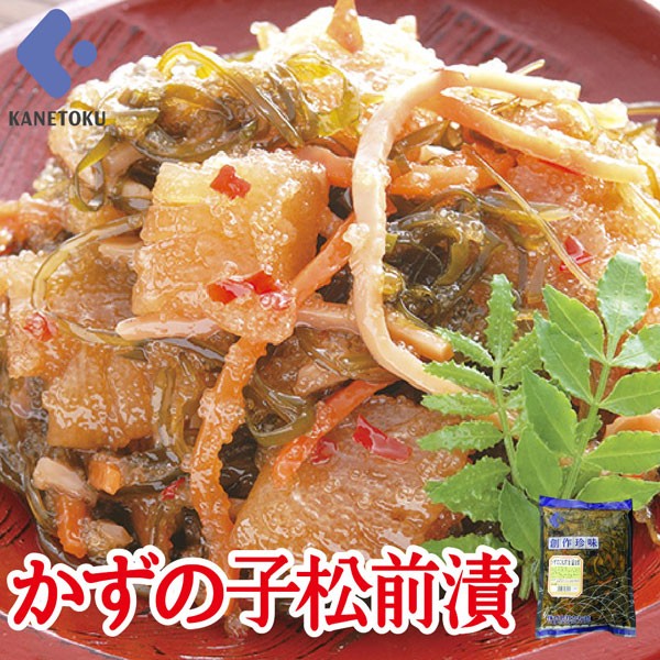 | 原材料名 | 塩かずの子(ニシンの卵(ロシア又はアメリカ又はカナダ又はデンマーク又はノルウェー)、食塩)、発酵調味料、昆布、還元水飴、しょう油、人参、するめ、砂糖、かつお節エキス、唐辛子、昆布抽出物、食塩、醸造酢/調味料(アミノ酸等)、酒精、酸味料、増粘剤(キサンタンガム)、保存料(ソルビン酸K)、(一部に小麦・いか・大豆を含む) |