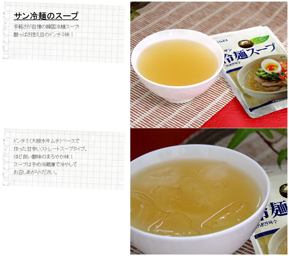 [スープ]果糖、砂糖、食塩、ドンチミエキス(大根エキス、きゅうりエキス、麦芽水あめ、食塩、砂糖、醸造酢、果糖、粉末キムチスープ、マルトデキストリン、牛肉シーズニング、にんにくエキス)