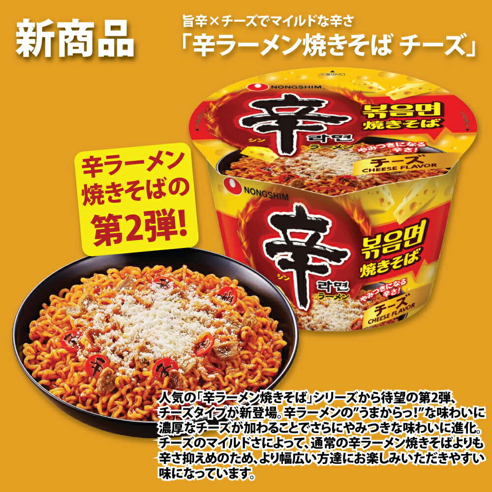 人気の「辛ラーメン焼きそば」シリーズから待望の第2弾、チーズタイプが新登場。辛ラーメンの”うまからっ!”な味わいに濃厚なチーズが加わることでさらにやみつきな味わいに進化。チーズのマイルドさによって、通常の辛ラーメン焼きそばよりも辛さ抑えめのため、より幅広い方達にお楽しみいただきやすい味になっています。
