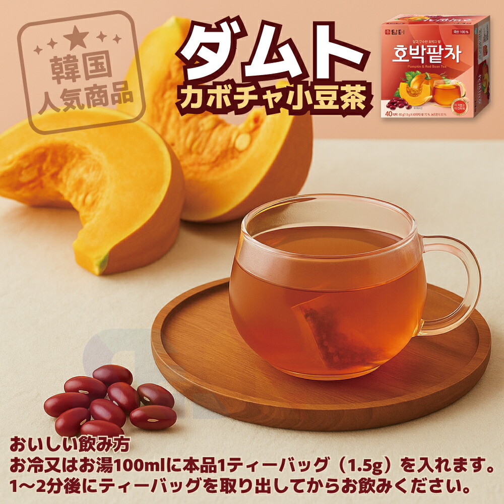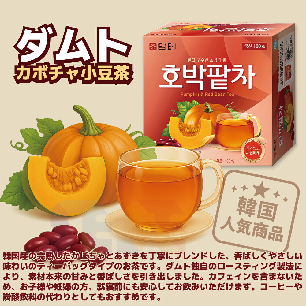 韓国産の完熟したかぼちゃとあずきを丁寧にブレンドした、香ばしくやさしい味わいのティーバッグタイプのお茶です。ダムト独自のロースティング製法により、素材本来の甘みと香ばしさを引き出しました。
