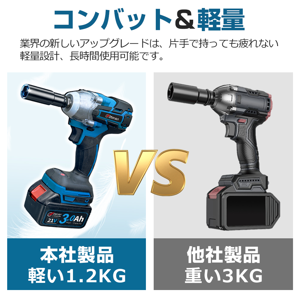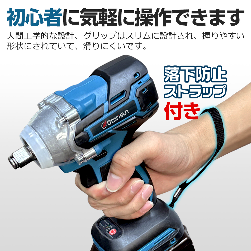 【コンパクト設計 × 軽量操作性】業界最新のアップグレードによる軽量設計,片手で長時間持っても疲れにくい使いやすさを実現。人間工学に基づくスリムグリップは滑り止め加工を施し,手の大きさや力に関係なくしっかり握れる形状に仕上げられています。インパクトレンチ初めての初心者や女性の方でも,気軽に操作できる使い勝手を備えています。