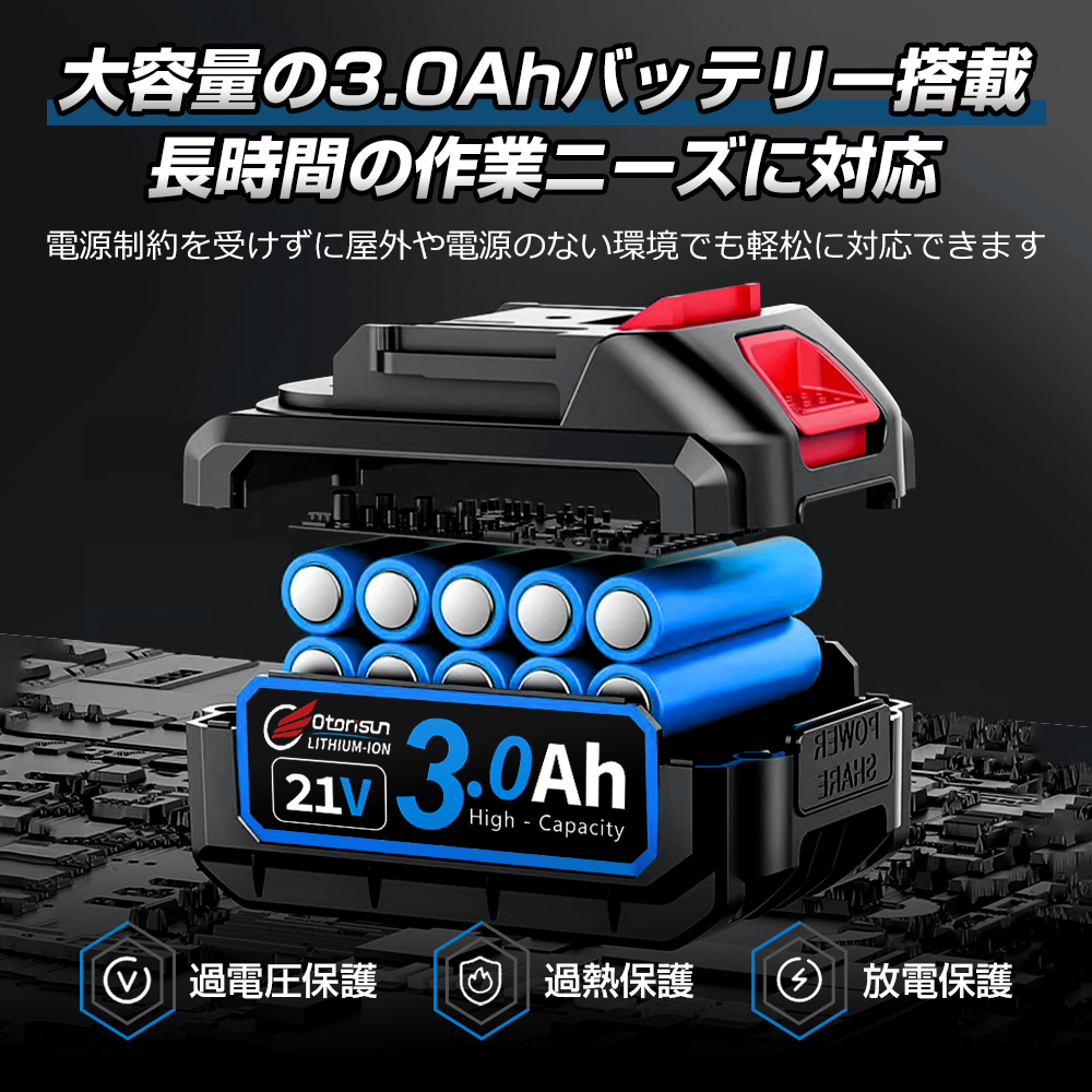 【大容量リチウムバッテリー搭載】 高性能リチウムバッテリーを搭載,長時間の連続作業ニーズに充分応えます。電源コンセントのない屋外や現場でも,充電一回で安定した動力を提供,コードの束縛から解放された自由自在な作業を実現します。