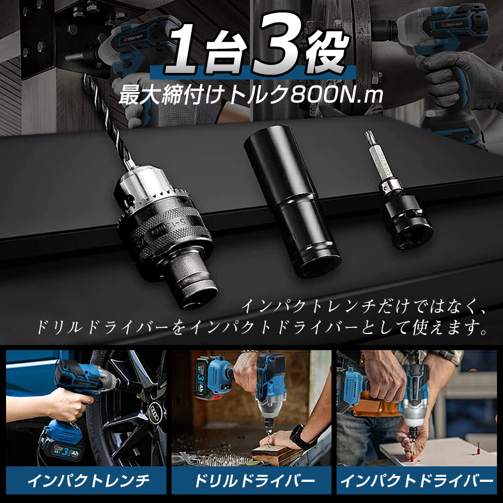 【一台 3 役の多機能対応】 充実した付属品を搭載することで,単なる自動車修理・タイヤ交換用のインパクトレンチだけでなく,ドリルドライバーやインパクトドライバーとしても使い分け可能。1 台で複数の作業シーンに対応,工具の収納スペースを節約するだけでなく,作業効率も大幅アップです。