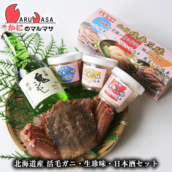 | 内容量 | ・北海道産 活毛ガニ350g×1尾 ・國稀 北海鬼ごろし 300ml×1本 ・函館塩辛三昧(いか塩辛、プレミアムいか塩辛、本生いか塩辛)各1個(70g) ボイルをご希望された場合、10%〜15%ほど目減りします。 ※ラベル・パッケージは変更になる場合があります。 |