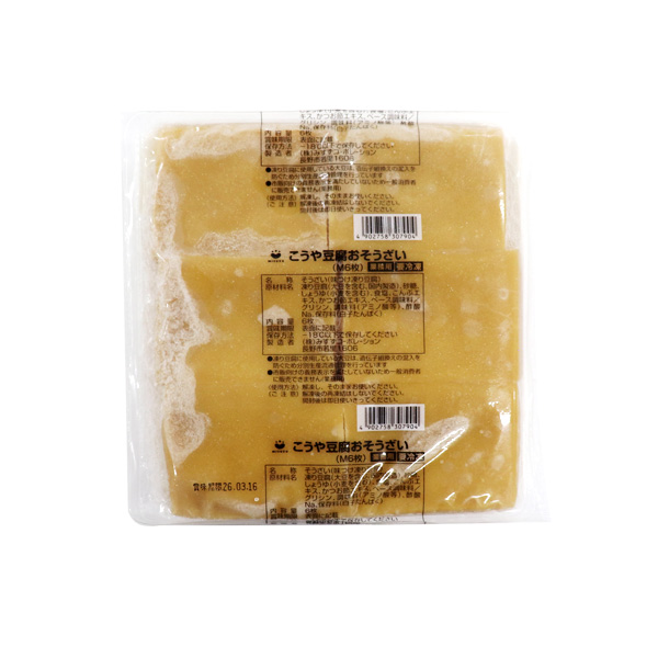 | 商品番号 | hjb00331 | | 原材料 | 凍り豆腐(大豆を含む、国内製造)、砂糖、しょうゆ(小麦を含む)、食塩、こんぶエキス、かつお節エキス、ベース調味料/グリシン、調味料(アミノ酸等)、酢酸Na、保存料(白子たんぱく) | | 名称 | そうざい(味つけ凍り豆腐) | | 内容量 | 6枚 | | 製造者 | みすずコーポレーション | | 保存方法 | −18℃以下保存 | | 配送方法 |  冷凍便でのお届けとなります。 |