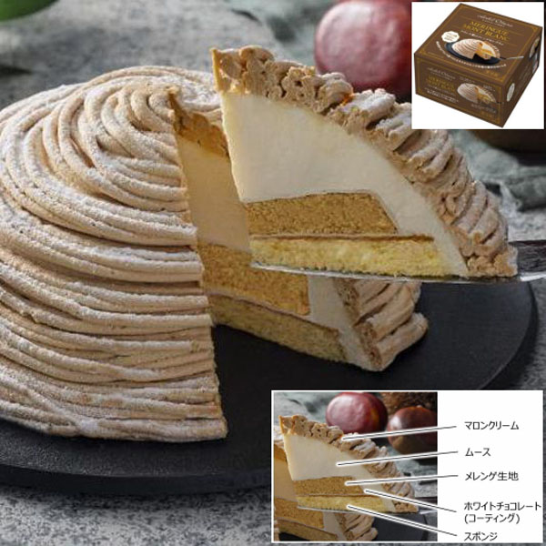 | 商品番号 | mac01311 | | 原材料 | フラワーペースト(生乳、砂糖、植物油脂、液全卵、でん粉、全粉乳加工品、小麦粉、ゼラチン、食塩、バニラ)(国内製造)、乳等を主要原料とする食品、全卵、マロンペースト(栗、砂糖、グルコースシロップ)、砂糖、準チョコレート、凍結卵白、加糖卵黄、小麦粉、粉糖、加工黒糖、バター、ヘーゼルナッツ、コーンスターチ、植物油脂、水あめ、ゼラチン/グリシン、加工澱粉、カラメル色素、乳化剤、膨脹剤、香料、pH調整剤、(一部に乳成分・卵・小麦・大豆・ゼラチンを含む) | | 内容量 | 横幅128mm高さ74mm | | 保存方法 | 冷凍 | | 賞味期限 | 解凍後2日 | | 配送方法 |  冷凍便でのお届けとなります。 |