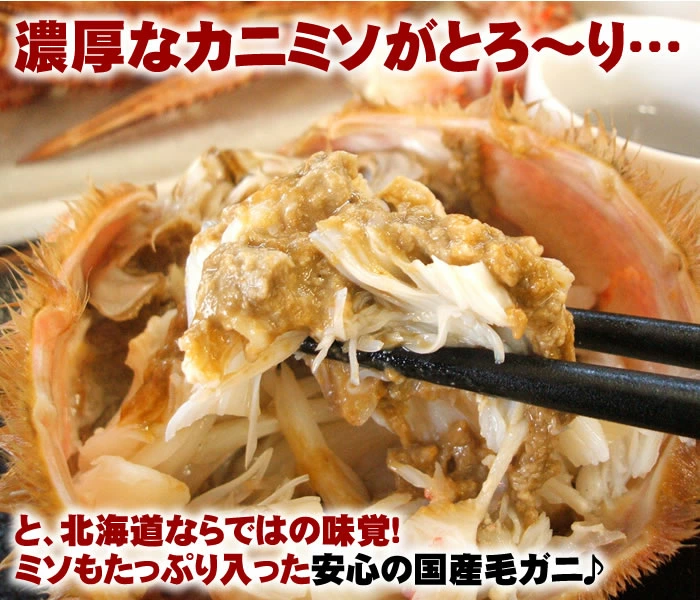 毛がにを活茹でし、急速冷凍しました。自然解凍後、殻をむいてお召し上がりください。(室温なら約半日、冷蔵庫なら約1日で解凍されます)