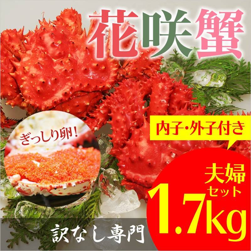 | 内容量・規格 | 食べ比べ 花咲蟹オス・メス2尾セット オス1kg前後+メス700g前後=1.7kg前後(メスは内子外子付き) |
