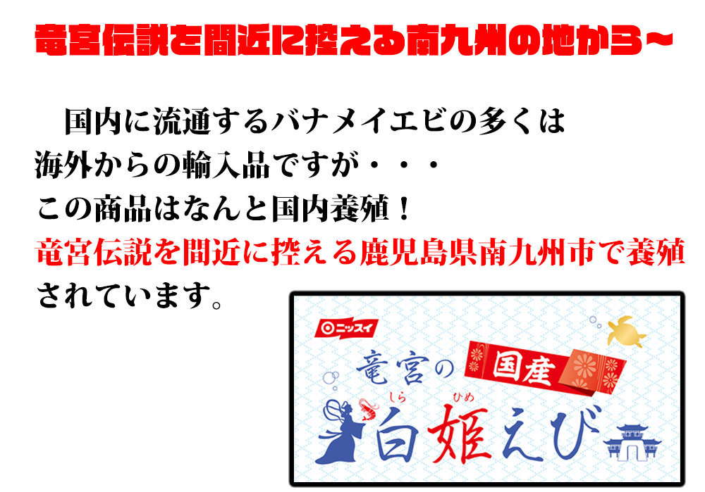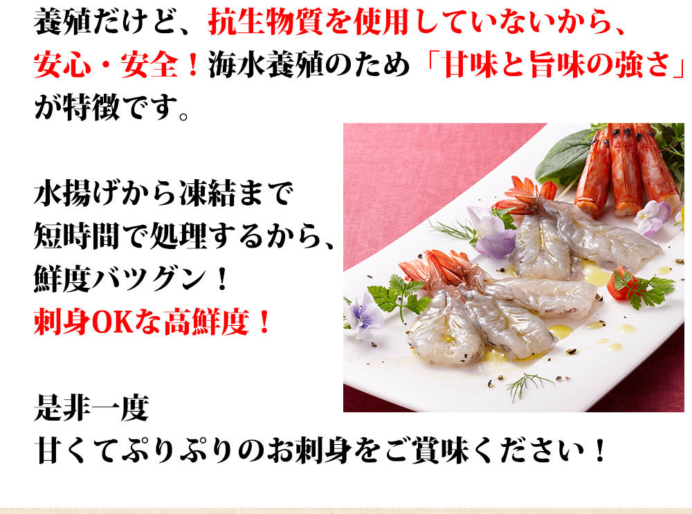 国内に流通するバナメイエビの多くは海外からの輸入品ですが、この商品は国内養殖。竜宮伝説を間近に控える鹿児島県九州市で養殖されています。養殖だけど抗生物質を使用していないから、安心・安全。海水養殖のため「甘味」と「旨味」の強さが特徴です。水揚げから凍結まで短時間で処理するから鮮度バツグン。刺身OKの高鮮度。500gあたり約20尾〜25尾入りサイズ。