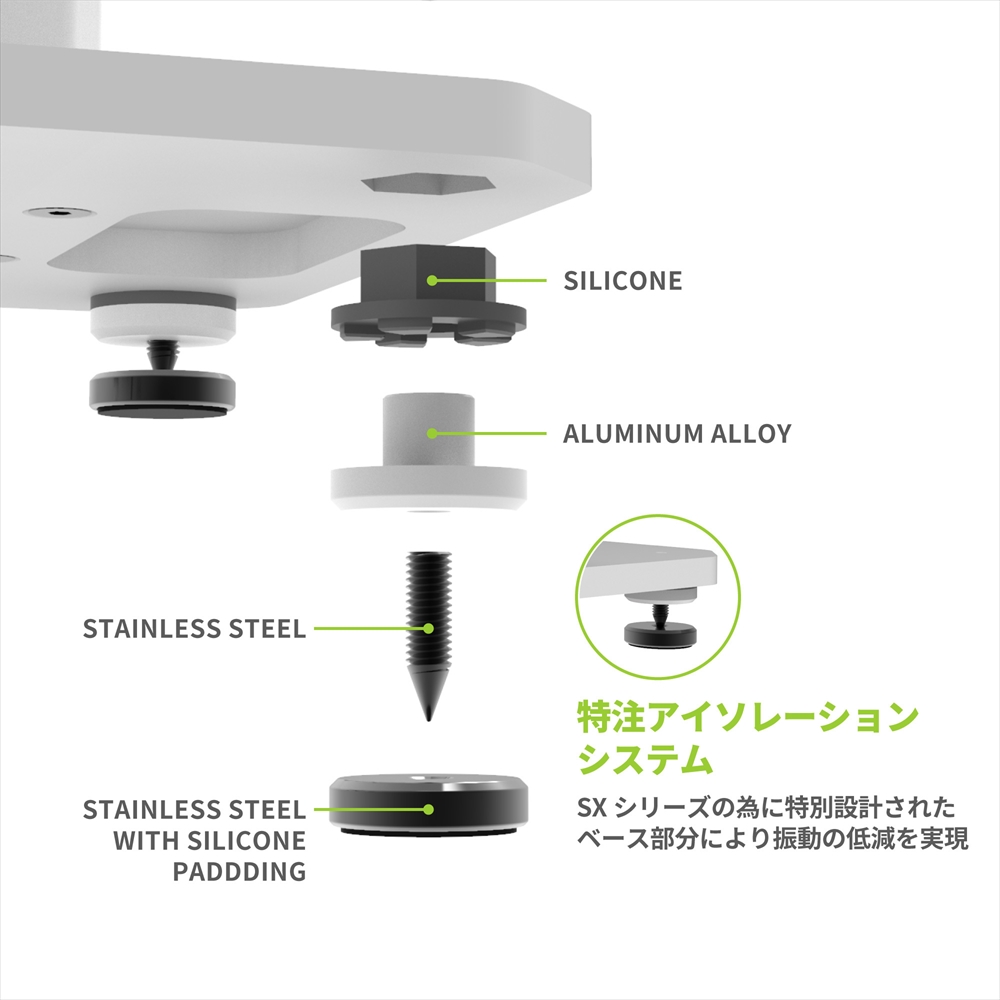 音質の向上SXシリーズの為に設計されたアイソレーション・システムにより、スピーカーの共振を低減。頑丈なベースプレートが重心を下げスタンドの転倒を防ぎます。