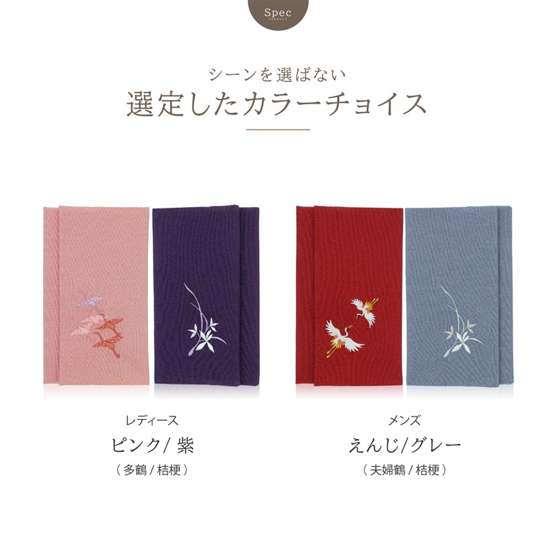 このふくさは、慶事と弔事の両方でご使用いただける便利なアイテムです。リバーシブルデザインで、一つのふくさで2つの色を楽しむことができます。ピンクを裏返すと紫になり、えんじを裏返すとグレーになります。素材には上質なちりめんを使用しており、組高品質な素材で作られているため、風合いや光沢が美しく、手に持つ際に上品な印象を与えます。ピンクの刺繍には多鶴のデザインが施されており、紫の刺繍には桔梗のデザインが施されています。一方、えんじの刺繍には夫婦鶴のデザインが施されており、グレーの刺繍には桔梗のデザインが施されています。それぞれの刺繍が華やかさや格式を演出し、特別な場にふさわしい装いとなっています。さらに、ピンク/紫のふくさは女性用として、えんじ/グレーのふくさは男性用としてデザインされています。美しいデザインと上質な素材で演出する「リバーシブル慶弔ふくさ」。特別な場にふさわしい装いを求める方にぴったりのアイテムです。
