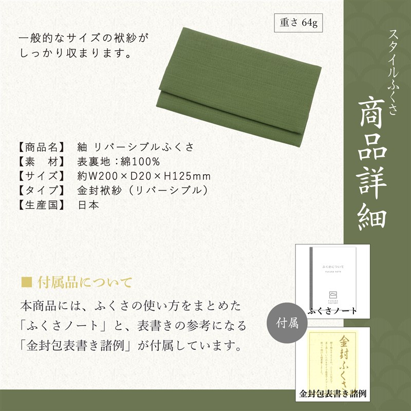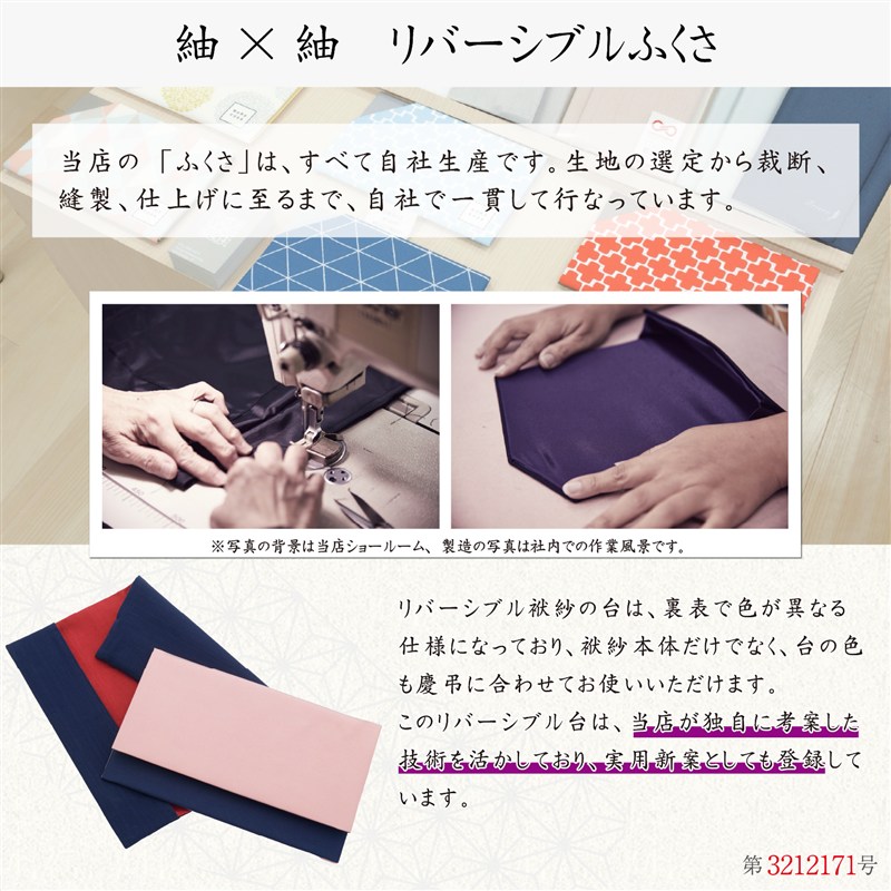 京都の老舗生地メーカーによる紬織り生地を使用し、職人の手で丁寧に仕立てた日本製のリバーシブルふくさです。節のある落ち着いた風合いと上品な光沢が特徴で、表と裏で異なる色を楽しめる仕様は、慶事・弔事どちらの場面にも対応。ふくさ本体だけでなく台の色も両面仕様となっており、用途に合わせた使い分けが可能です(実用新案登録済)。すべて自社工房にて、生地選びから裁断・縫製・仕上げまで一貫して行っており、品質にこだわる方にも安心してお選びいただけます。初めての方にもわかりやすい「ふくさノート」と「金封包表書き諸例」付き。カラーは〈紺×紅葉〉〈老緑×紅葉〉〈古代紫×紺〉の3種をご用意しました。