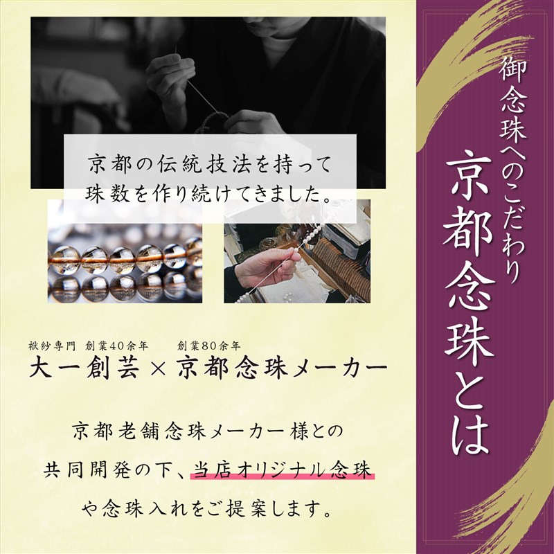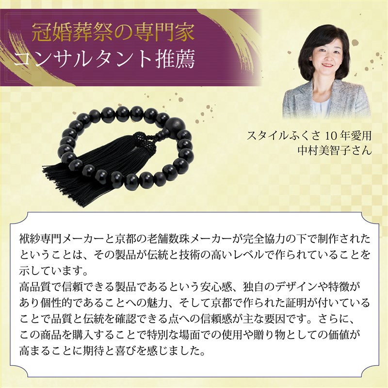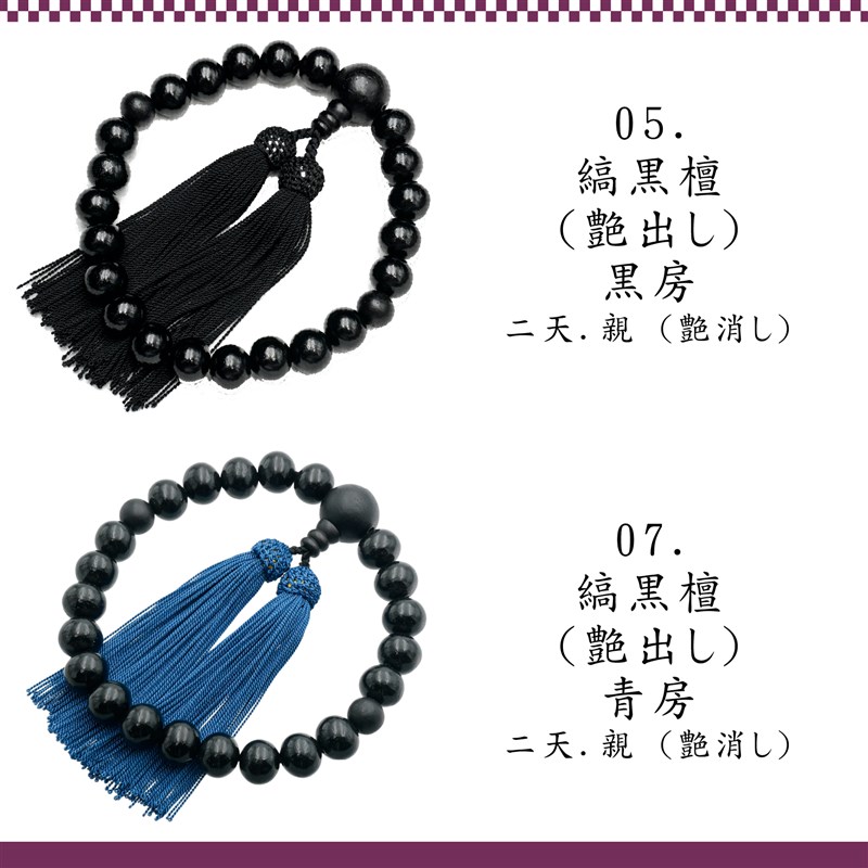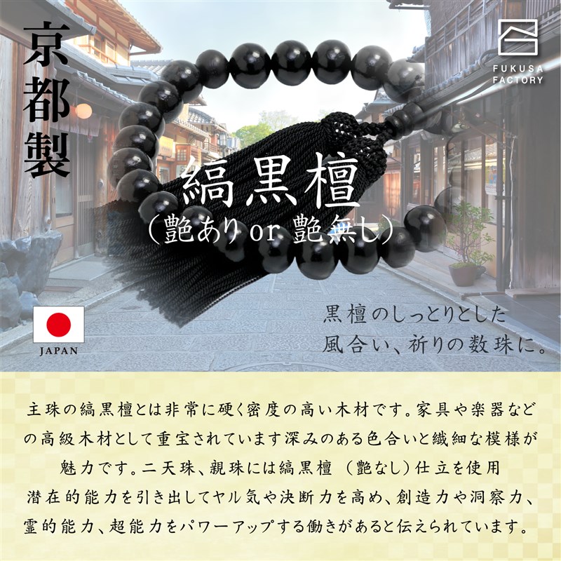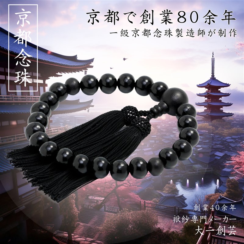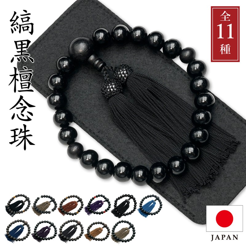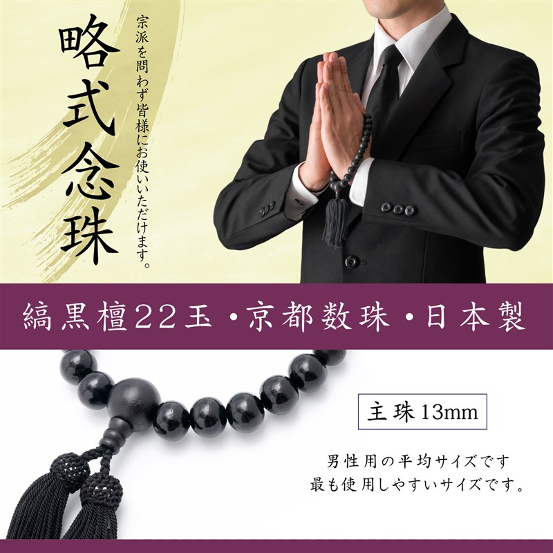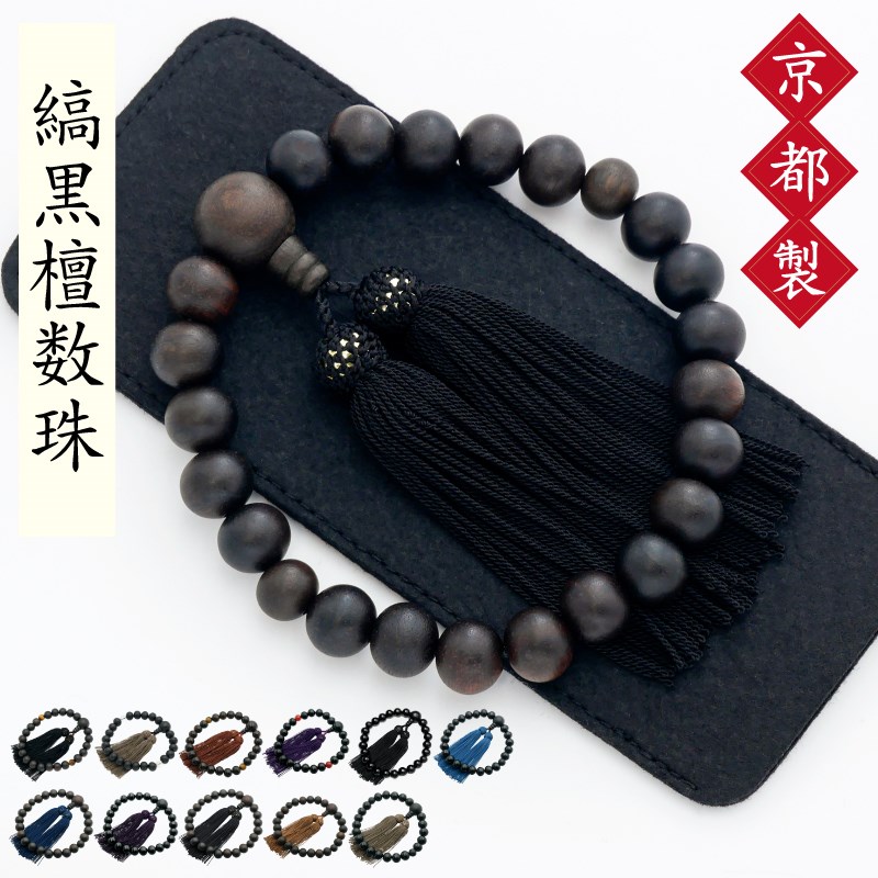 この京都製の縞黒檀念珠は、葬儀や法事、お通夜、お墓参りなど、あらゆる宗派でお使いいただける略式念珠です。縞黒檀は、心を静める美しい仏具として信仰を深めることができ、四国お遍路のお供にも最適です。この縞黒檀念珠は、念珠製造師の匠の技で仕立てられ、逸品としての価値を持っています。さらに、簡易数珠入れも付属しており、大切な数珠を保管する際に便利です。天然の黒檀を使用しているため、色味の違いが個々にあります。ご了承ください。 商品仕様は以下の通りです。