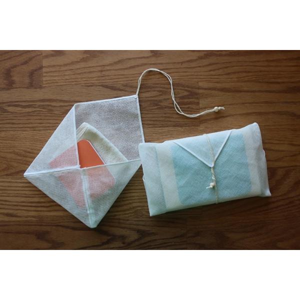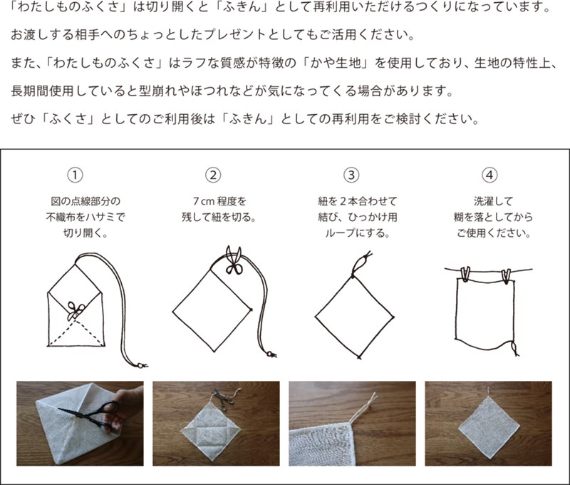 「わたしものふくさ」は切り開くと「ふきん」として再利用いただけるつくりになっています。お渡しする相手へのちょっとしたプレゼントとしてもご活用ください。また、「わたしものふくさ」はラフな質感が特徴の「かや生地」を使用しており、生地の特性上、長期間使用していると型崩れやほつれなどが気になってくる場合があります。ぜひ「ふくさ」としてのご利用後は「ふきん」としての再利用をご検討ください。