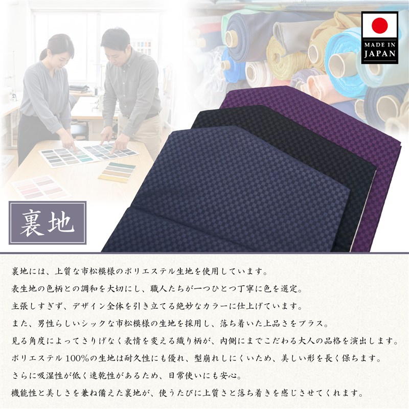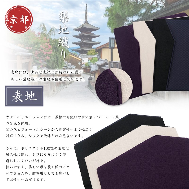 国内の袱紗専門メーカー「大一創芸(FUKUSA FACTORY)」が、お客様の声「袱紗の蓋が開いてしまう」をもとに開発した、意匠登録出願中の新構造「差し込み式」を採用したスタイリッシュなメンズ袱紗「留紗 -Tomesa-」。祝儀袋を入れた後に蓋もポケットへ差し込むことで、中身の飛び出しを防ぎ、スマートに持ち運べる画期的なデザインです。表地には上品な光沢と独特の凹凸が美しい京都の梨地織り、裏地には高級感ある市松模様のポリエステル生地を採用。シワや型崩れに強く、美しい形を長く保てる日本製です。サイズは一般的な金封に対応する約H205×W125×D6mm、重さ約36gと軽量でスーツの内ポケットにも収まります。慶事用ベージュ、慶弔両用の紫・黒の3色展開で、あらゆる冠婚葬祭シーンに対応します。冠婚葬祭のマナーや袱紗の使い方がわかる「大人のたしなみ手帳」付きで、これ一つでフォーマルシーンのマナーを美しく実践できる逸品です。
