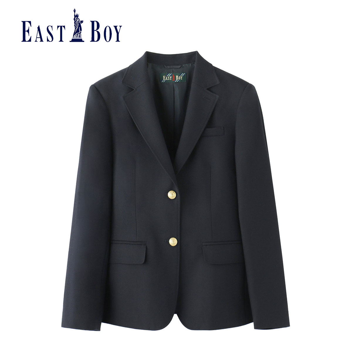 | イーストボーイの定番トラディショナルな2つボタンブレザーです。中に12ゲージのニットを着用できるサイズ感です。ウール100%で上品な光沢があり、ソフトな手触りと弾力性のあるサキソニー生地。裏地はEASTBOYロゴ入りオリジナル素材を使用。金釦はEASTBOYのオリジナルロゴと紋章入り。左身裏に内ポケット付き。(スラッシュポケット) |