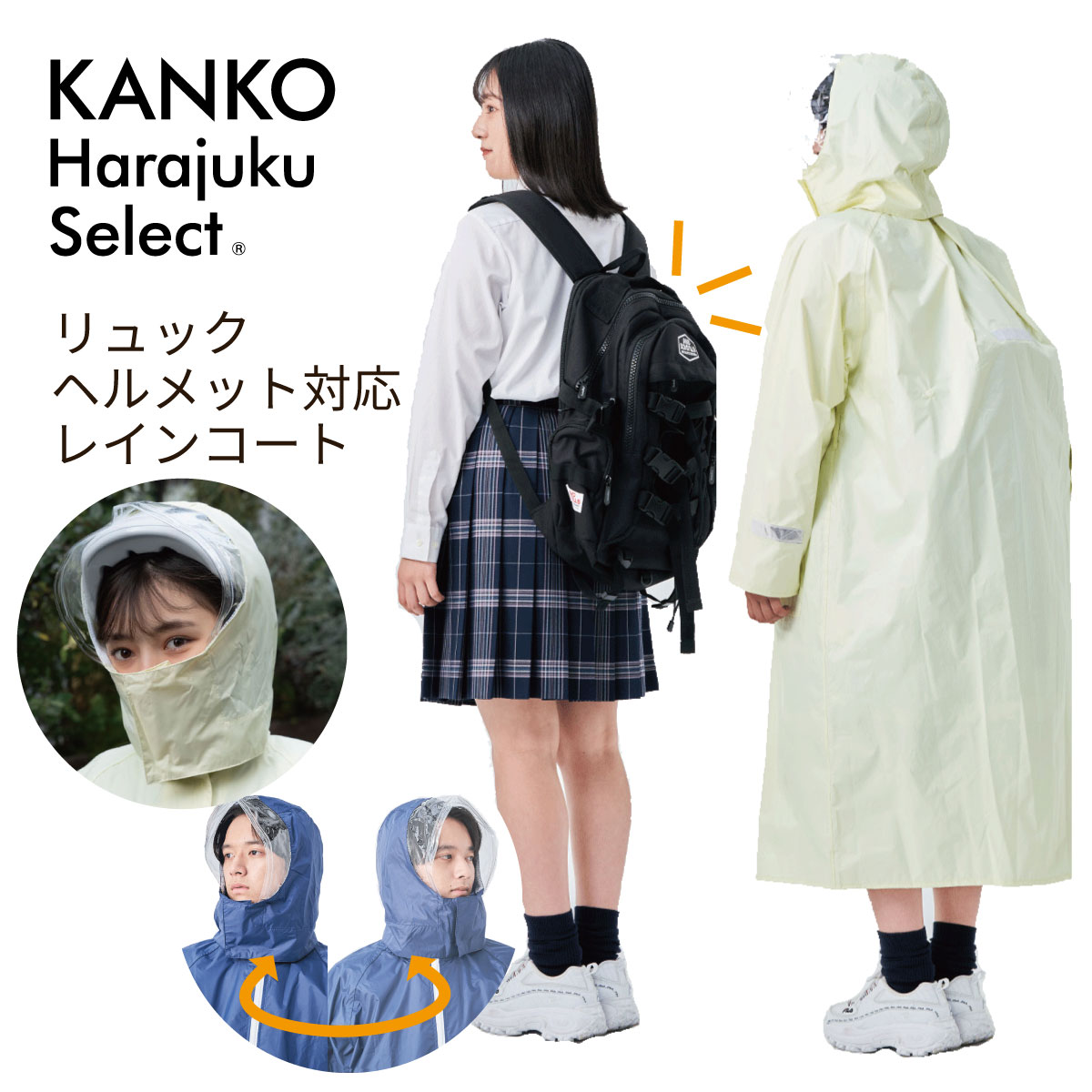 ●特長:自転車通学におすすめの、大型リュックを背負ったまま着用できる、ロング丈レインコートです。