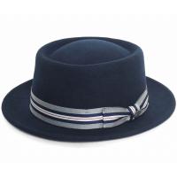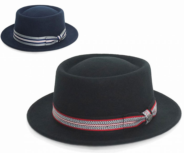 トップがフラット気味な円筒状のクラウンに、エッジをへこませて中央に膨らみを作り出したデザインのポークパイハットです。 中折れなどに比べるとやや柔らかい印象で上品な雰囲気もあります。 ツバは基本オールアップしていますがポークパイの中では比較的長めの作りなのでなだらかな反りあがりに。 コーディネートの主役にもなりえる存在感ある見た目は、巻き部分がアクセントになっています。