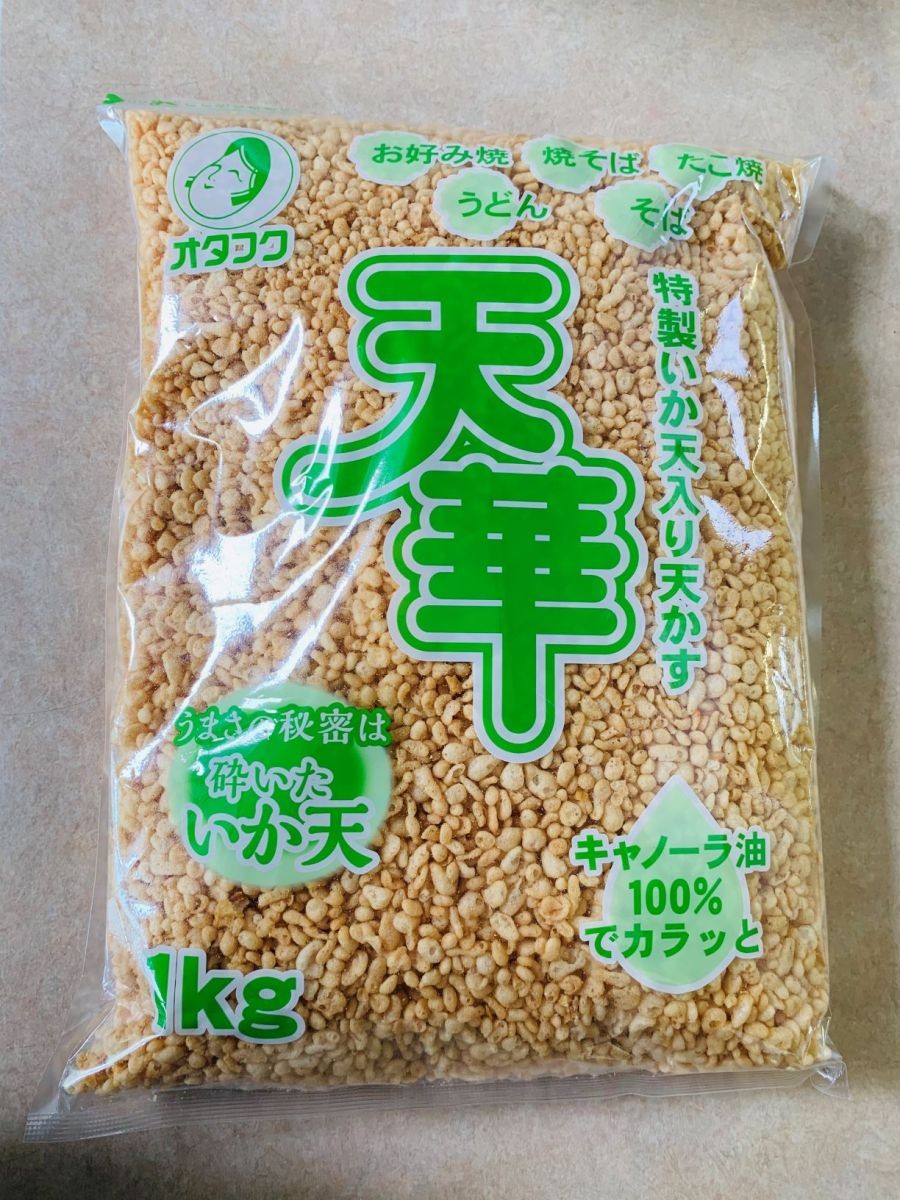 ●するめ100%のいか粉をブレンドし風味豊かに、いか天(皮付きのするめを薄く伸ばし、衣をつけて揚げたもの)を入れることによりサクっとした食感と旨みが強い天かすです。