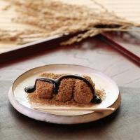 コシのあるしっかりとした羽二重餅に、深煎りした滋賀県産大豆のきな粉をまぶし、香り高く仕上げた〈閼伽井(黒蜜きなこ)〉。