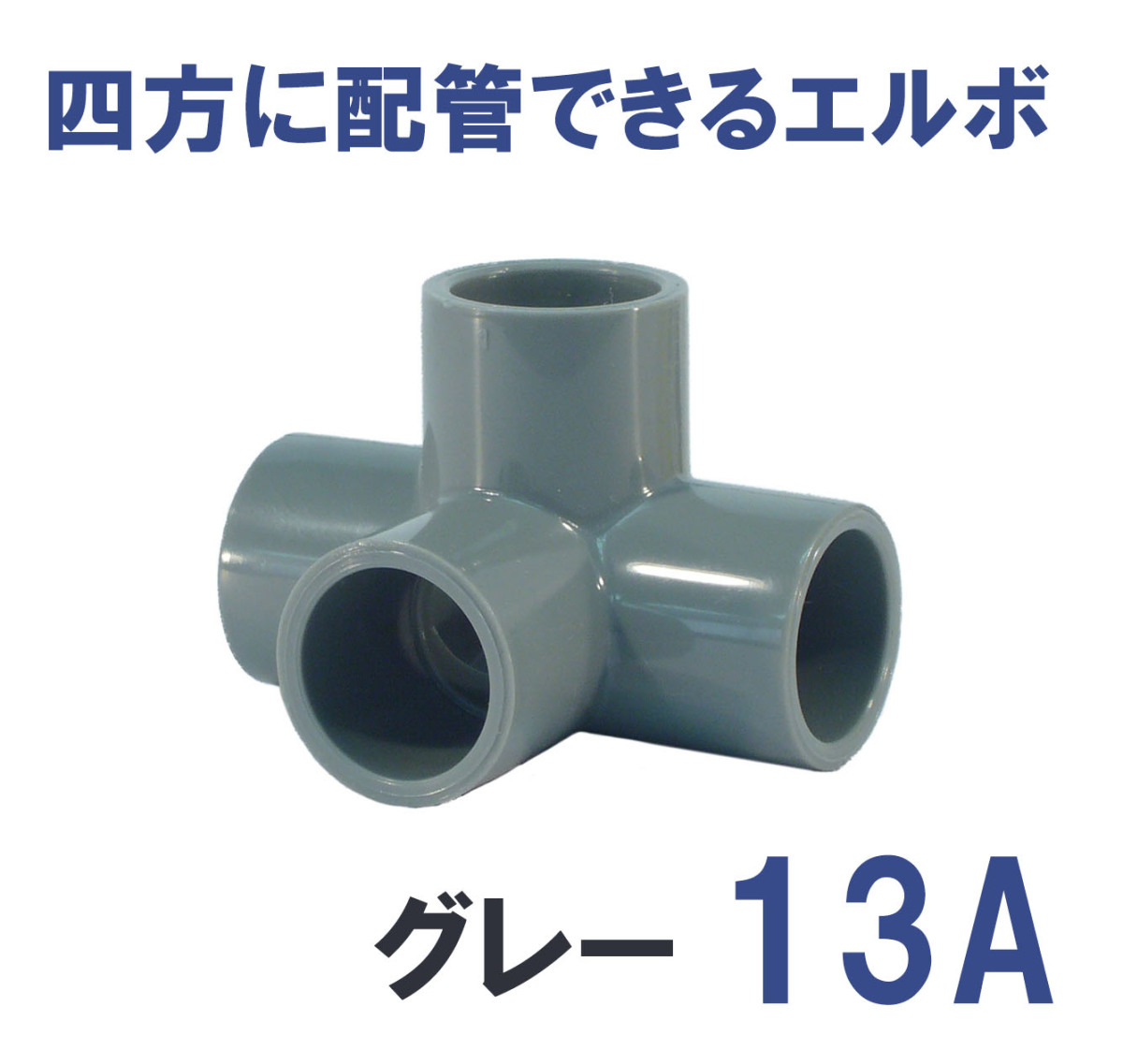 省スペースで配管できる塩ビ(PVC)継手(ジョイント)です。VP13Aのパイプを四方に差し込み、接着します。